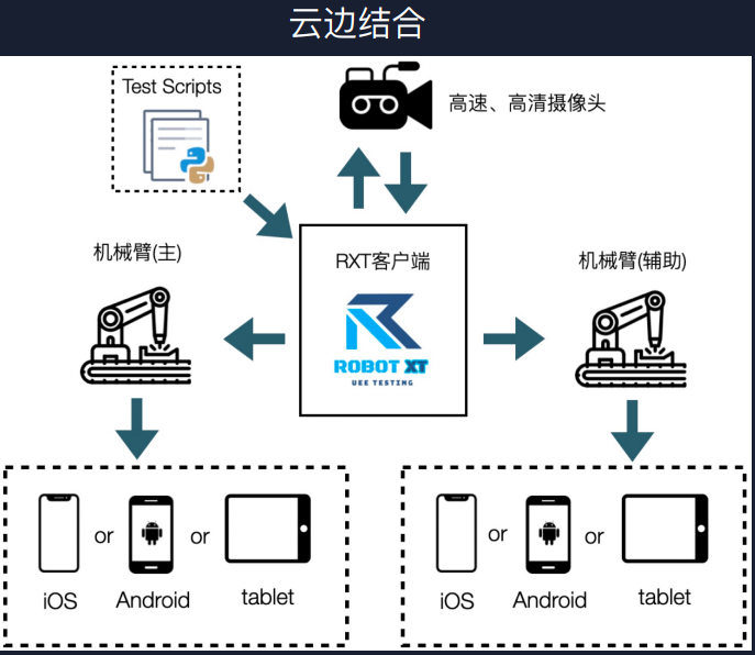 “为模拟真实用户”,Robot-XT 极测机器人提供了为用户体验度量评测的能力,不仅可以最大程度地模拟用户真实操作,还实现了多设备跨终端的功能自动化和用户体验度量。同时,Robot-XT 极测机器人,通过 IoT+AI 的智能化技术搭建了一套支持多机操作,并具备高稳定性的 UEE 自动化解决方案,实现了从线上 App 到线下智能门店场景的端到端自动化测试,
