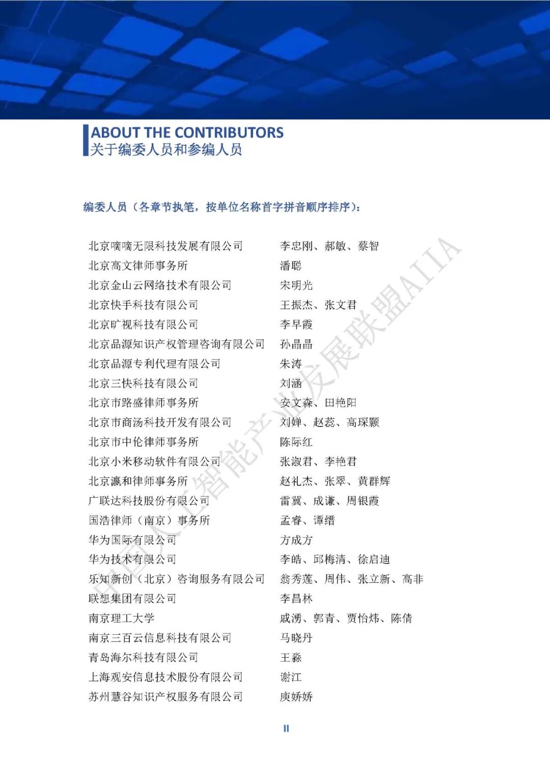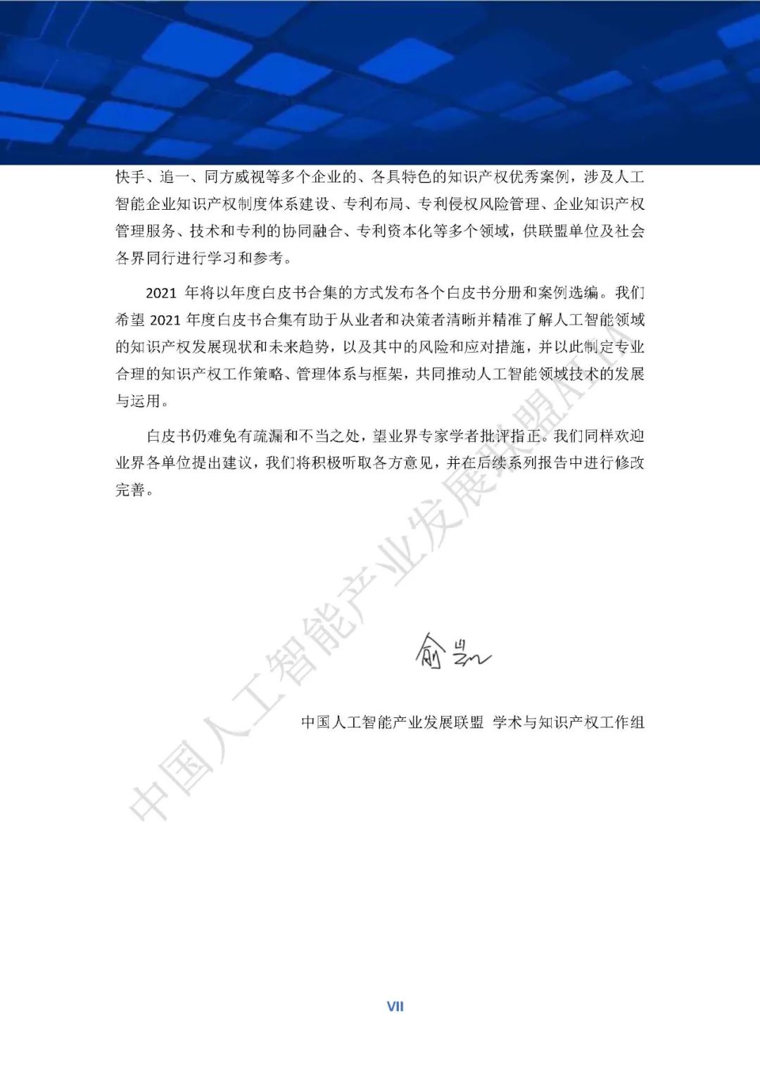 另外,本白皮书还附有工作组征集的来自小米、眼控科技、中国移动、商汤、快手、追一、同方威视等多个企业的、各具特色的知识产权优秀案例,涉及人工智能企业知识产权制度体系建设、专利布局、专利侵权风险管理、企业知识产权管理服务、技术和专利的协同融合、专利资本化等多个领域,供联盟单位及社会各界同行进行学习和参考。