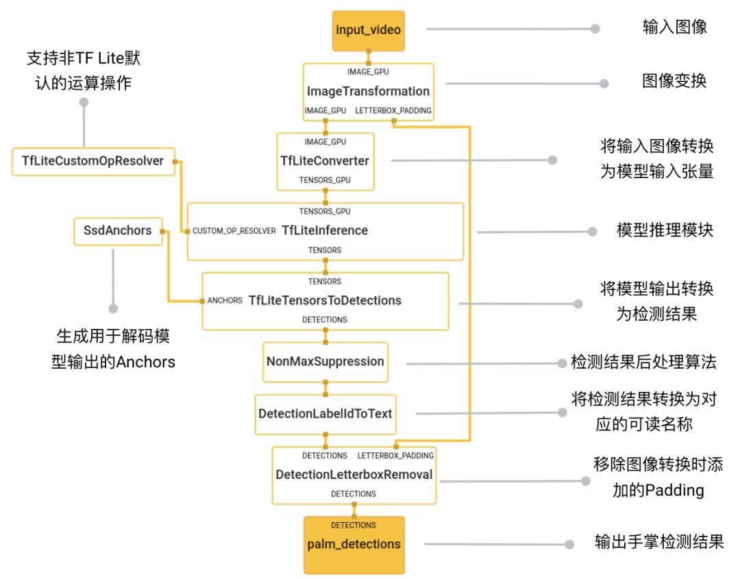 手掌检测应用的核心部分为上图中的蓝紫色模块(HandDetection子图)。如下图所示,HandDetection 子图包含了一系列图像处理的计算单元和机器学习模型推理的模块。ImageTransformationCalculator 将输入的图像调整到模型可以接受的尺寸,用以送入 TF Lite 模型的推理模块;使用 TfLiteTensorsToDetectionsCalculator,将模型输出的 Tensor 转换成检测结果;运用 NonMaxSuppressionCalculator 等计算单元做后处理;最终从HandDetection子图输出检测结果给主图。
