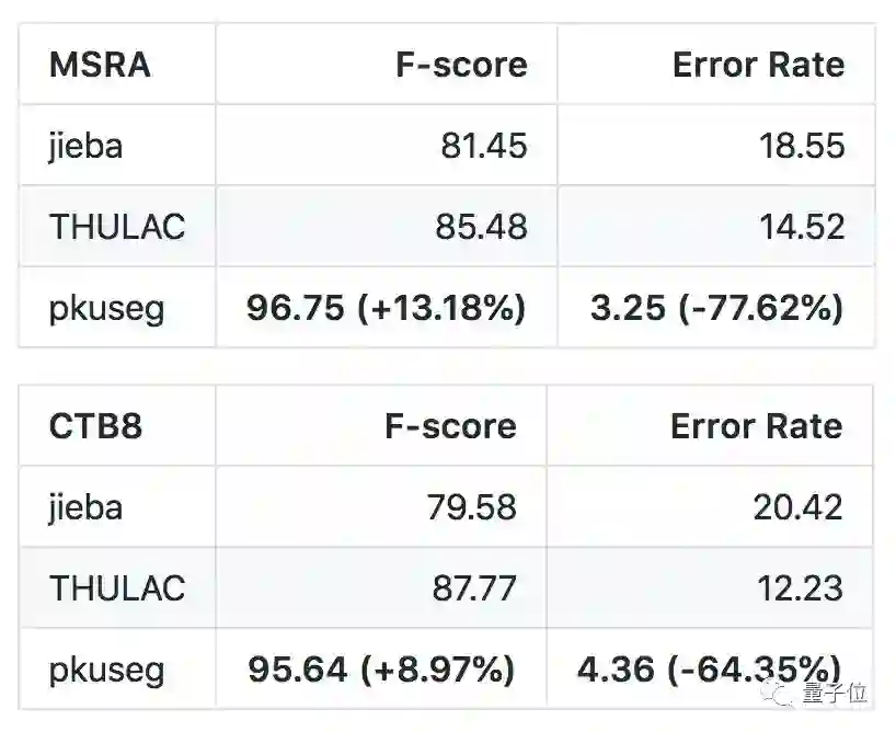 在F分数和错误率两项指标上,PKUSeg都明显优于另外两位对手。