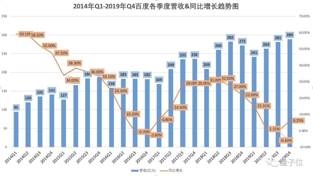 2019年第四季度,百度总营收为人民币289亿元(约合41.5亿美元),与上年同期相比增长6%,与上一季度相比增长3%。