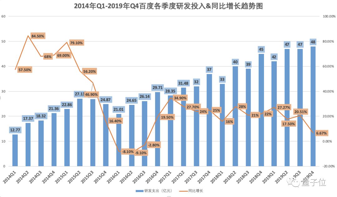 依然比营收增幅要大,2019年达到183亿元(约合26.4亿美元),比2018财年增长16%。足以反映出百度对技术研发的坚定信念。