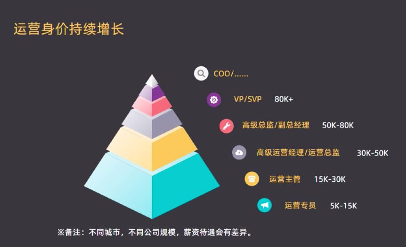 刚入行的运营薪资通常在5K~15K之间,平均2~3年晋升一次;