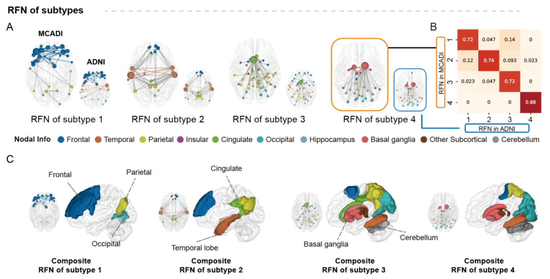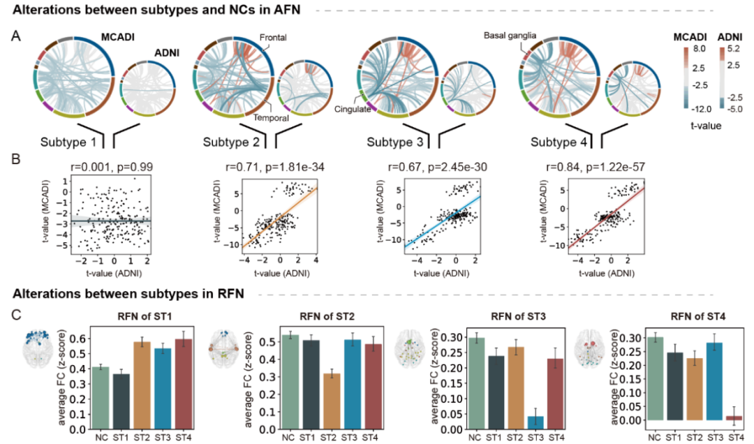 进一步,研究发现4个AD亚型的功能网络损伤模式存在显著差异。相比于正常老年人,亚型1具有轻微但弥漫全脑的功能网络异常;亚型2的功能网络异常主要集中于默认网络且伴随前额叶网络的异常升高;亚型3在前扣带回相关的功能网络中存在显著降低,同时具有前额叶网络的异常升高;亚型4的功能网络降低集中于双侧基底神经节,其伴随前额叶网络的异常升高(图3A)。更重要的是,除了弥漫性损伤的亚型以外,其他亚型的特异性损伤模式在MCAD和ADNI数据集上具有高度可重复性(图3B)。除此以外,各个亚型的脑网络损伤特异于其对应的RFN,在其他亚型的RFN中损伤较轻微(图3C)。