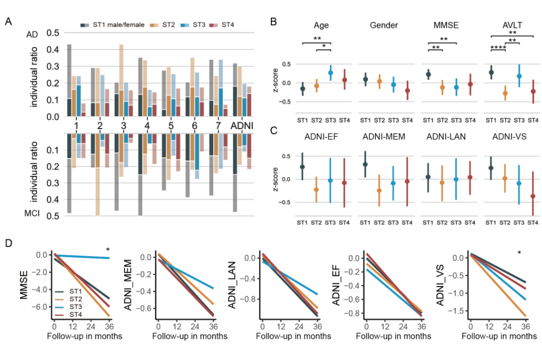 鉴于两个数据集间亚型对应的RFN和脑网络损伤模式高度一致性,后续统计将两个数据集进行合并研究。在人口学特征上,4个亚型在所有数据站点和数据库中均有分布,并且在性别比例上不存在显著差异。而在年龄分布上,亚型3相对年长于亚型1和亚型2。在认知功能上,亚型1的认知能力最好,亚型3和亚型4次之,亚型2的认知能力最差。进一步利用ADNI的随访信息,发现尽管亚型1认知能力较好,但其疾病进展仍旧很快。认知能力相对差的亚型3的认知能力保持最好。各个亚型在不同的认知领域上具有不同轨迹,例如在视觉空间能力上,亚型1具有比亚型3更慢的下降速度。结果表明识别脑网络的异质性有助于辨别不同的认知损伤模式,未来有望实现更加精准地施以干预措施,更加有效地减缓疾病进程。
