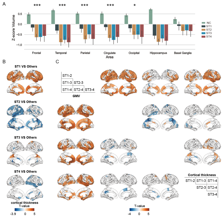 在亚型间的脑萎缩比较上,亚型1显示了最轻的脑萎缩,亚型2显示了最严重的萎缩,亚型3和亚型4具有类似的萎缩程度但具有不同的萎缩模式。亚型1在海马区域具有和其他亚型类似的损伤程度,但在其他脑区具有更轻微的萎缩;亚型2在左侧颞叶、楔前叶以及中央旁小叶上具有最严重的萎缩;亚型3在扣带回具有最严重的萎缩;亚型4在右侧颞叶和枕叶具有最严重的萎缩。结果表明,不同的脑网络亚型对应与不同的脑萎缩模式,反映了潜在的不同病理机制。
