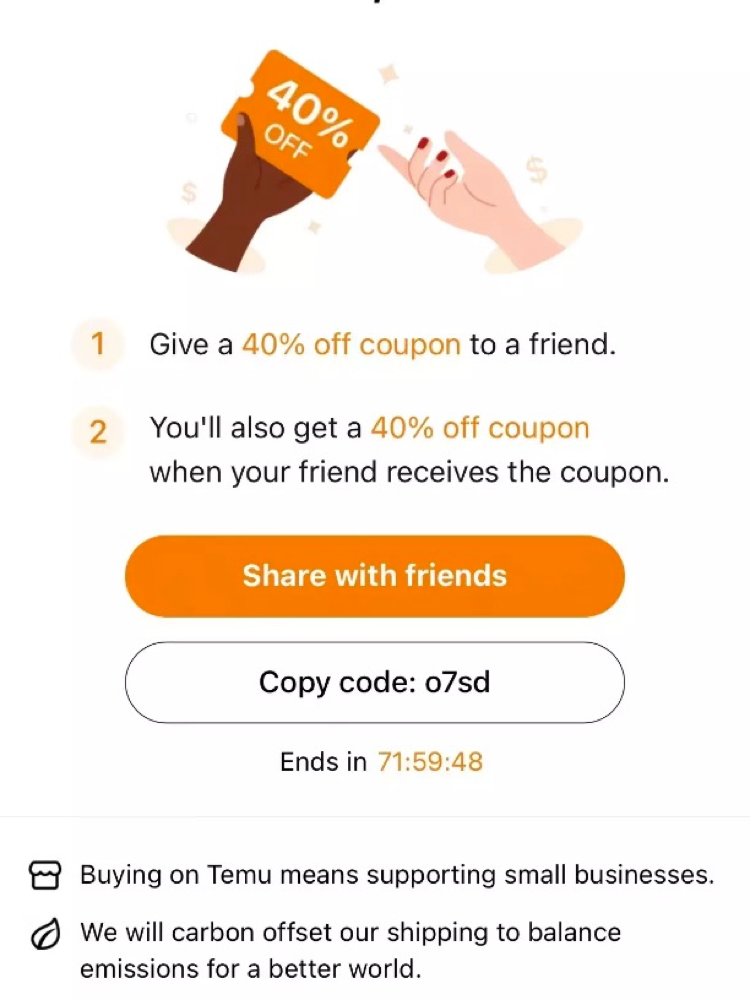 虽然,Temu并没有上线“砍一刀”功能。不过,只要将链接分享给朋友,双方都能享受40%的折扣。这有一点类似于国内好友拼单的模式。因此,在小红书等社交平台上,出现了一波自来水分享。一些人甚至找到了最佳省钱攻略,一位IP地址在美国的用户在社交平台上分享,折扣上限是10美元,而40%的折扣拼到25美元刚好可以优惠10美元,买25美元是最划算的。
