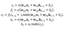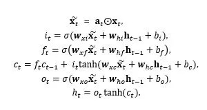 其中,x_t表示当前时刻t的输入向量,h_(t-1)表示t-1时刻的隐状态向量。i_t、f_t、o_t、c_t、h_t分别表示该LSTM神经元中的输入门、遗忘门、输出门、记忆单元和隐状态(输出)。w_aβ,b_β为模型参数,σ为Sigmoid激活函数。可以看到,遗忘门f_t影响着对历史信息,即存储在记忆单元c_(t-1)里的信息的保留程度。输入门i_t则影响着当前时刻信息x_t存储到记忆单元的量。