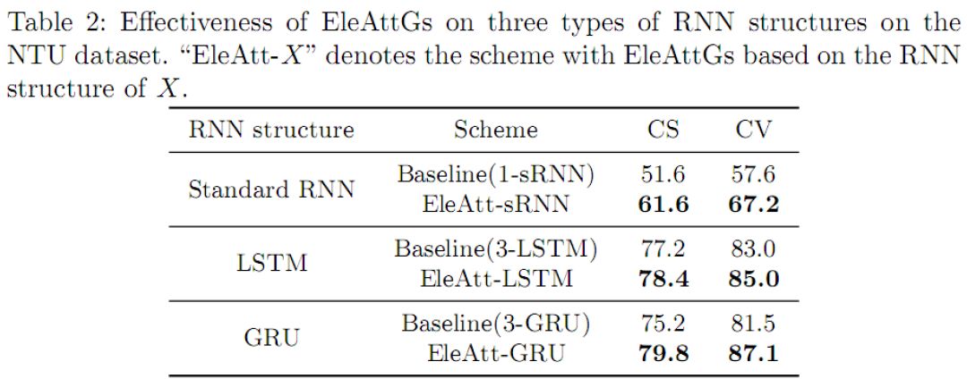 元素注意力RNN层作为一个通用设计,除了3D骨架数据,也可以被用于处理其它数据。在这里,我们通过使用CNN在RGB帧提取的特征作为RNN网络的输入,来验证该注意力机制在CNN特征上仍然有效。表1比较了元素注意力GRU(EleAtt-GRU)和原始GRU (Baseline-GRU)在基于RGB的视频行为识别上的性能,其显示元素注意力GRU比原始GRU识别精度高2%-3.8%。