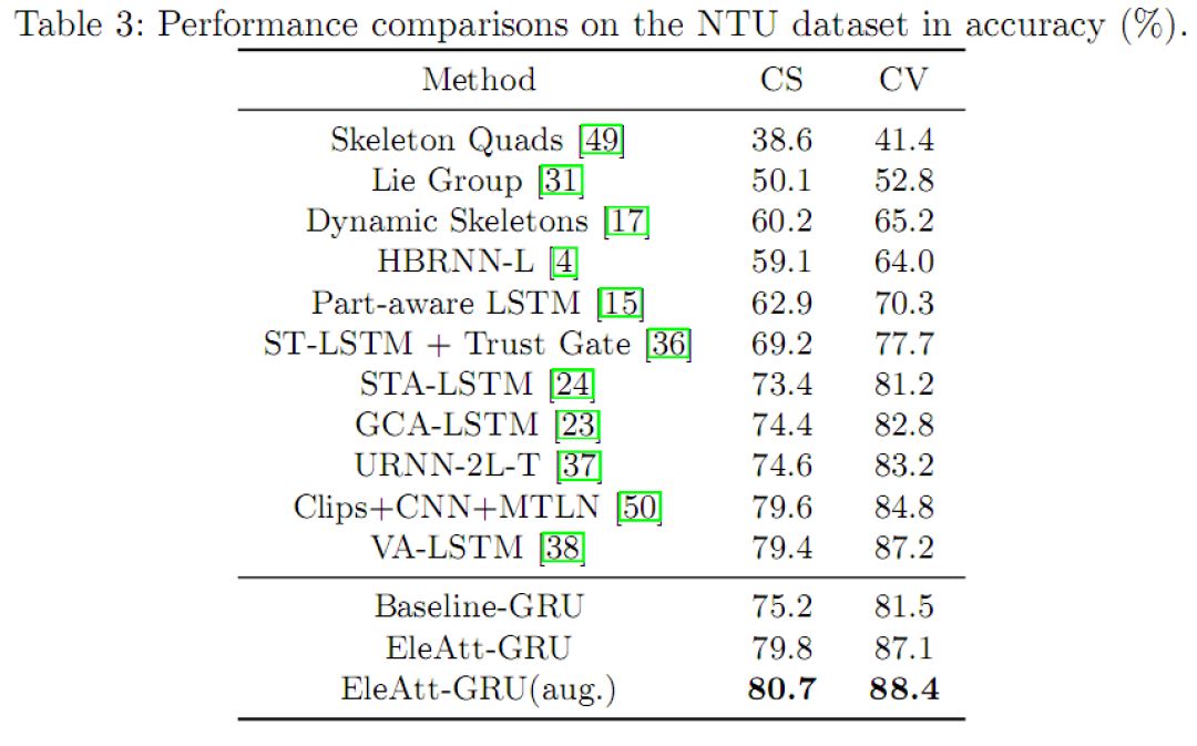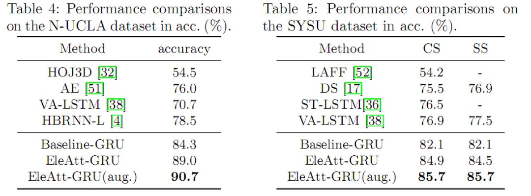 为了检验元素注意力RNN的高效性,我们在基于3D骨架(3D skeleton)数据的行为识别,以及基于RGB的行为识别上分别做了实验。