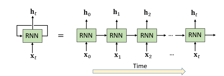 循环神经网络(Recurrent Neural Networks, 缩写RNNs),例如标准RNN、LSTM、GRU等,已经被广泛用于对时间序列数据的处理和建模,来解决许多应用问题,例如行为识别、机器翻译、手写识别等。RNN在对时域动态特性建模以及特征学习上具有强大的能力。如图1所示,在每个时间步,RNN神经元通过当前时刻的输入x_t和前一时刻的隐状态信息h_(t-1)来更新当前时刻的隐状态h_t,从而具有对历史信息的记忆性。