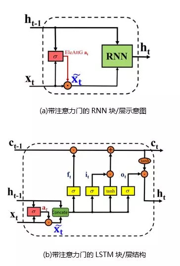 图2 拥有自注意能力的元素注意力RNN块/层的结构示意图。红色模块表示新加的元素注意力门。(a)展示了注意力门结构在RNN上的示意图,此RNN可以是标准RNN、LSTM或GRU;(b)给出了具体的带注意力门的LSTM层结构。注:一个RNN块/层可以由若干RNN神经元组成,例如N个。隐状态h_t的维度等于该层的神经元个数,即N。