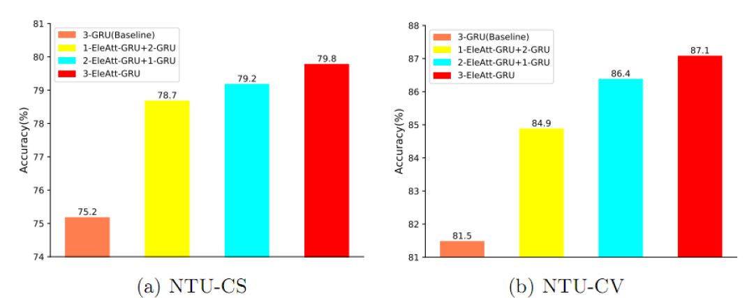 我们在NTU数据库上通过基于3D骨架的行为识别任务来分析元素注意门的效率。如图3所示,对于3层GRU网络,当第一层GRU被换为元素注意力GRU后,识别精度在Cross-Subject和Cross-View的设置下分别提升了3.5%和3.4%。随着替换层数的增加,性能也随之增加。当三层均被替换为元素注意力GRU后,识别精度较之于基准网络实现了4.6%和5.6%提升。元素注意力RNN层作为通用的设计,可以用在RNN网络的任何一层。