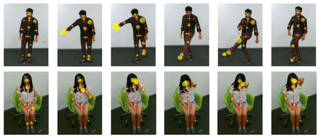 图5 在基于3D骨架的人类行为识别任务上,根据第一层元素注意力GRU上注意力门响应值的大小在各个骨架节点上进行可视化。
