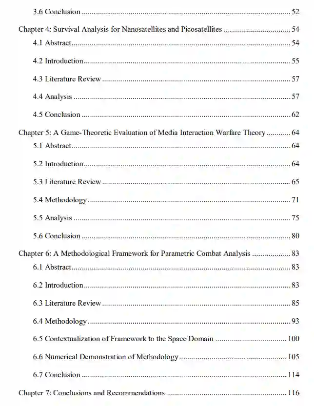 第4章,"纳米卫星和皮卡卫星的生存分析",发表在第35届小型卫星年会的论文集上,回答了研究问题三:大型和小型航天器的可靠性模型之间存在什么相似之处?(Hayhurst, Bettinger, & Schubert Kabban, 2021)这项工作是该框架的基础部分,因为各自的可靠性模型在框架内被用来建立混合战略,作为每个交战方的人口参数。