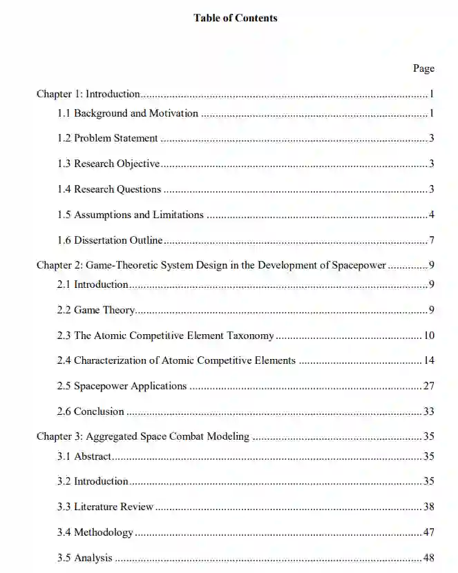 第2章,"空间力量发展中的博弈论系统设计",发表在《航空与空间力量杂志》上,回答了研究问题一:博弈论如何为空间力量提供信息?(Hayhurst & Colombi, 2021)这项工作是框架的基础部分,因为博弈论在框架内被用来将具有相应的成对损耗系数的异质部队结构提炼成总的损耗系数,以便在差分参数作战模型中使用。