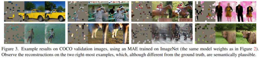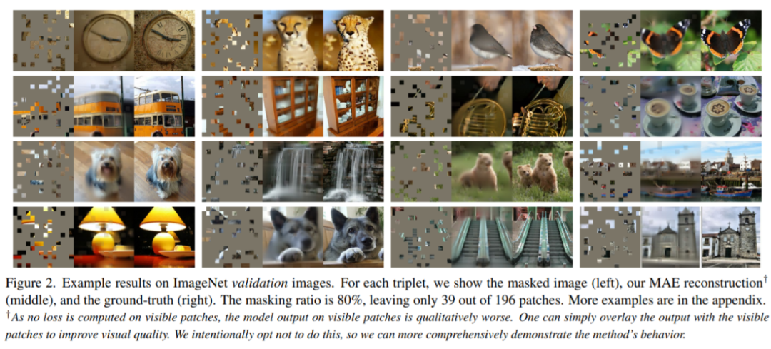 为了克服这种差异并鼓励学习有用的特征,研究者展示了:一个简单的策略在计算机视觉中也能非常有效:掩蔽很大一部分随机 patch。这种策略在很大程度上减少了冗余,并创造了一个具有挑战性的自监督任务,该任务需要超越低级图像统计的整体理解。下图 2 - 图 4 展示了这一重建任务的定性结果。