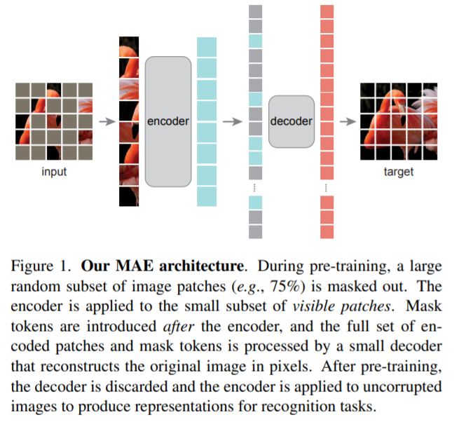 基于以上分析,研究者提出了一种简单、有效且可扩展的掩蔽自编码器(MAE)用于视觉表征学习。该 MAE 从输入图像中掩蔽了随机 patch 并重建像素空间中缺失的 patch。它具有非对称的编码器 - 解码器设计。其中,编码器仅对 patch 的可见子集(没有掩码 token)进行操作,解码器则是轻量级的,可以从潜在表征和掩码 token 中重建输入(图 1)。