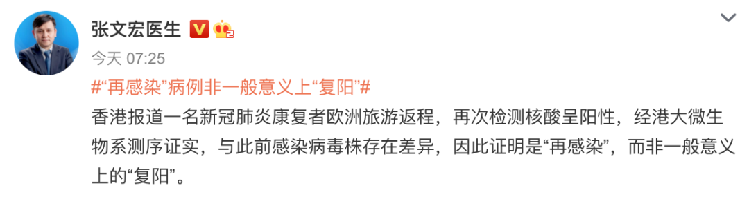 张文宏医生表示,要注意“再感染”与一般意义上“复阳”的区别。