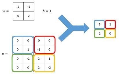 卷积神经网络中特征识别的基本手段是卷积(Convolution)。我们可以理解为把图片进行特效处理,新图片的每个位置的像素值是原图片对应位置及相邻位置像素值的某种方式的叠加或取反,类似于Photoshop中的滤镜如模糊、锐化、马赛克什么的,TensorFlow中称为过滤器(Filter)。卷积的计算方式是相邻区域内像素的加权求和,用公式表示的话,仍是,不过计算限定在很小的矩形区域内。