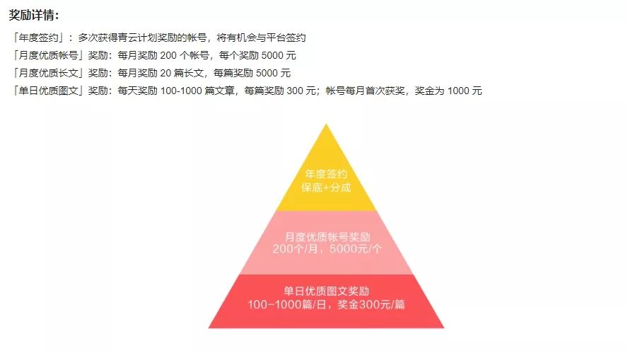 拿图文文章来说,青云计划每个月的第1篇是1000元,之后是300元,一个月30天,上不封顶,你能写多少,它就给多少。只要内容优质,有没有粉丝,都不是大问题。
