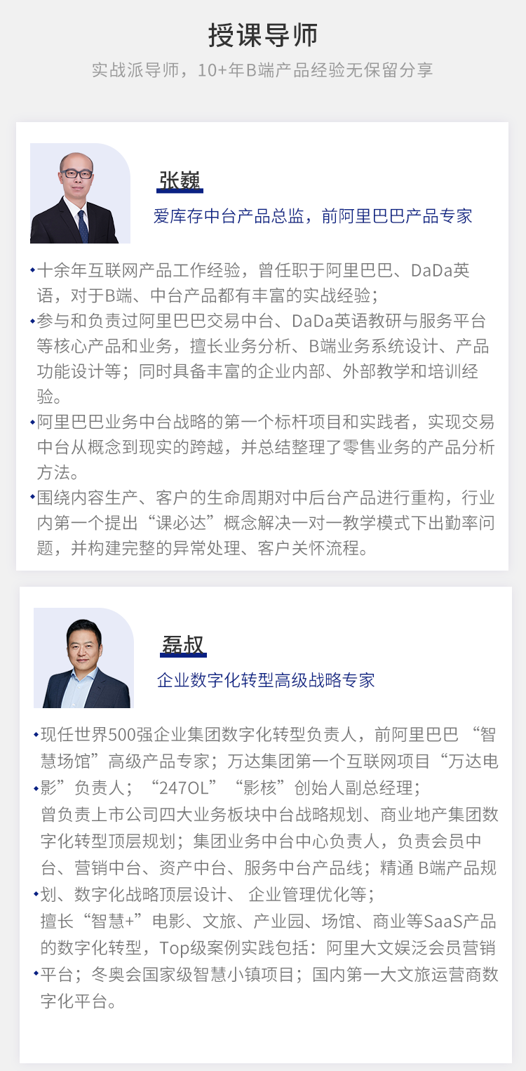 于是,我们在一线互联网公司产品专家/总监以上职位,且有操盘过丰富大体量项目的候选导师中,不断筛选、寻找最合适的人选。
