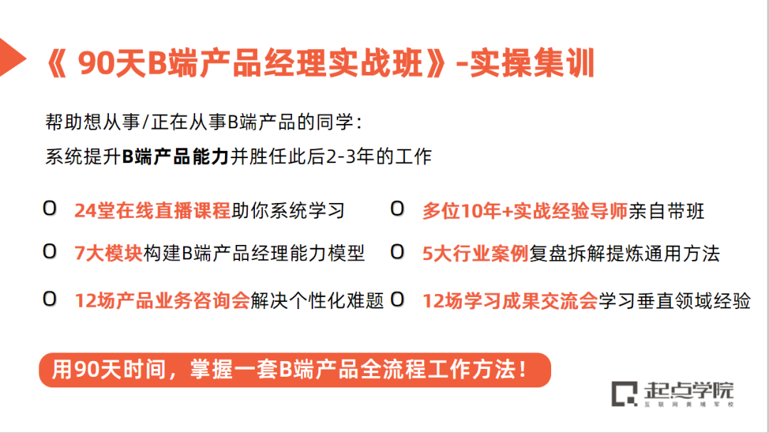 强烈推荐你报名腾讯课堂&起点学院联合打造的B端产品体系课——《90天B端产品经理实战班》,多位老师结合10多年的领域/B端产品经验,相信能给你带来不小的启发。