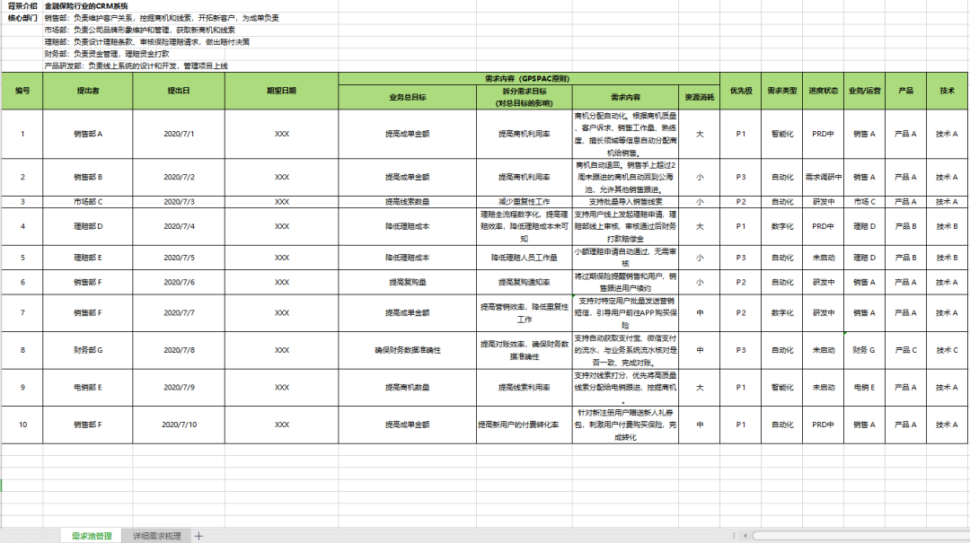 整个需求池的整理,涵盖提出者、提出日期、期望日期、业务总目标、拆分需求目标(对总目标的影响)、具体需求内容、资源消耗、优先级、需求类型(自动化、数字化、可视化、智能化等)、进度状态等核心内容,整体内容十分详尽和完整,且逻辑清晰。