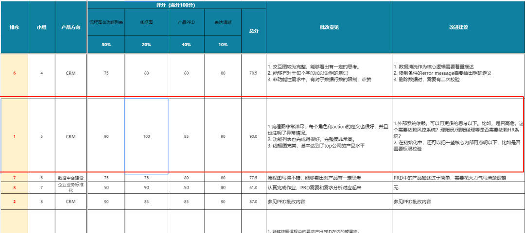 比如PRD模块作业,老师基于“流程图&功能列表、线框图、产品PRD、表达清晰”等维度综合评分,并给出具体的优缺点点评以及落地改进建议~