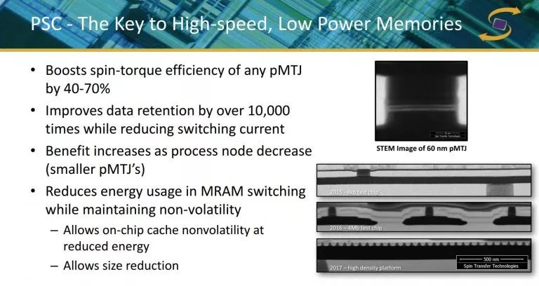 PSC结构一开始就被设计成模块化,可以用任何pMTJ来制造:无论是该公司自己的pMTJ,还是其他来源的pMTJ。PSC结构是在pMTJ沉积过程中制造的,使pMTJ部件的高度增加了约4纳米。该结构与一系列广泛的标准MRAM制造工艺、材料和工具箱兼容,因而任何工厂都能轻松将PSC结构做入到现有的pMTJ部件中,并不显著增加复杂性或制造成本。