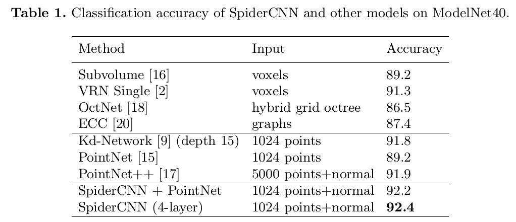 ModelNet40上的实验表明,SpiderCNN在标准基准测试中达到了92.4%的最先进精度,并且在分割任务上表现出了竞争力。