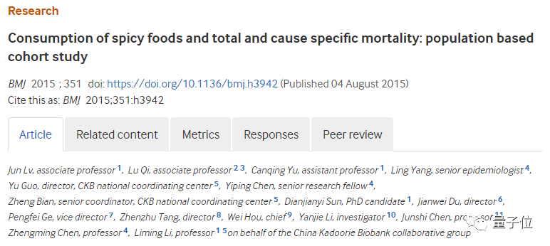 一项关于吃辣和死亡率的研究在《英国医学杂志》(BMJ)上发表,名为《Consumption of spicy foods and total and cause specific mortality: population based cohort study》。