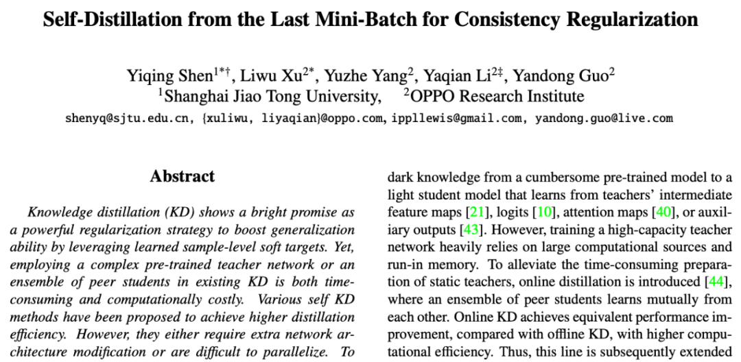 近日, OPPO 研究院联合上海交通大学将视角聚焦到知识蒸馏的范式本身,提出了新的自蒸馏框架:DLB(Self-Distillation from Last Mini-Batch),模型无需额外的网络架构修改,对标签噪声具有鲁棒性,并大幅节约训练的空间复杂度。此外,在三个基准数据的实验中,模型达到了 SOTA 性能。相关论文「Self-Distillation from the Last Mini-Batch for Consistency Regularization」已被 CVPR 2022 收录。