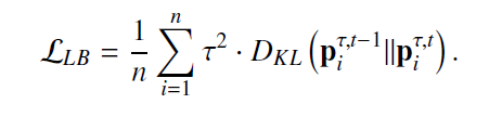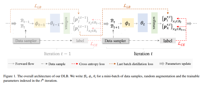 不同于以往采用预先训练 teacher 模型的方式生成(P_i^τ ) ̃,DLB 采用训练中前一个 Batch 蕴含的信息生成(P_i^τ ) ̃,并将其作为正则化的即时平滑标签。