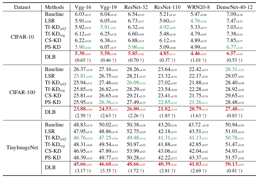 具体而言,在平均错误率层面, DLB 在 CIAFR-100 改进幅度为 0.83% 至 2.50%,在 CIFAR-10 上为 0.37% 至 1.01%,在 TinyImageNet 上为 0.81% 至 3.17。值得一提的是,DLB 的表现明显优于 Tf-KD 和 PS-KD,这证明了 DLB 在模型泛化提升上的优势。
