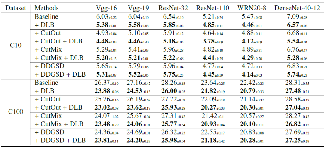 为了评估 DLB 与基于数据增强正则化方法的兼容性,研究员在 CIFAR-10 和 CIFAR-100 上将 DLB 与 CutMix、CutOut 和 DDGSD 相结合。如下所示,实验表明通过结合 DLB 和基于增强的正则化,可以实现额外的性能增益。
