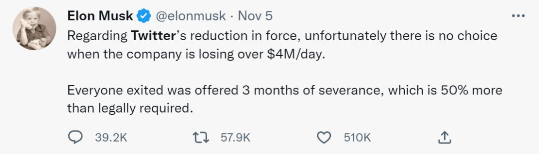裁员伊始,马斯克就在推特上发文称:「很不幸的是推特开始裁员,当公司每天亏损超过 400 万美元时,我们别无选择。」马斯克承诺所有被解雇的员工将获得 3 个月的基本工资作为遣散费。