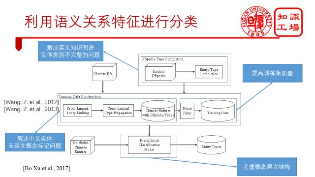 我们首先通过远程监督的方式构建了一个训练集,包括使用了跨语言实体链接技术构建了中文实体和英文实体的等价关系,然后通过跨语言分类传递方法,将英文实体的分类信息传递给等价的中文实体,接着,通过之前提到的训练集过滤算法,得到一个去噪后的训练集。当然,为了使这个结果更好,我们进行了额外的两步优化:第一步,针对DBpedia实体不完整的情况,对DBpedia的分类关系进行了填充,利用到了DBpedia实体的标签信息;第二步针对Dbpedia本体的树状结构,提出了一个层次化的分类算法。具体实现大家可以看我们发表的这篇论文。