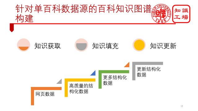接下来,我将以CN-DBpedia为例,介绍如何对单百科数据源进行深度抽取。后面我们讲的百科知识图谱构建均表示对单百科数据源进行深度抽取的构建方法。总的来说,百科知识图谱构建分为三个部分,第一个是知识获取,就是通过自动的方法将网页数据转化为高质量的结构化数据。第二个是知识填充,即在现有数据的基础上加以完善,得到更多结构化的知识。第三个是知识更新,就是保证你所获得的知识永远是最新的。