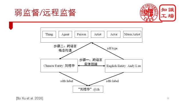 更多情况下,我们遇到的问题是没有训练集,例如,我们要将百度百科的实体分类到英文DBpedia的本体上去。所以我们可以通过一种被称为弱监督或者远程监督的方法来构建训练集,即首先建立起中文百度百科实体和英文DBpedia实体的等价关系,再把英文实体的分类关系传递给等价的中文实体,通过这种方式就能为一些中文百度百科实体获得标记数据了。