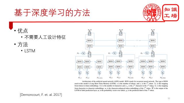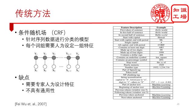 传统最好的方法是使用条件随机场来进行序列数据标记。它同时考虑了每个单词的特征以及句子的顺序性,但缺点是需要专家人为设计一套特征,如下图右边所示,特征选择的好坏直接影响分类的结果。同时,也不具有通用性,英文的需要设计一套特征,换成中文的话,又要设计另外一套特征了。