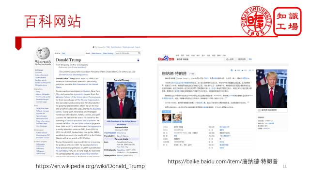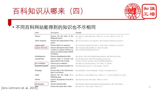 当然,不同百科网站能得到的知识也不尽相同。Wikipedia中就有一些百度百科中没有的知识,比如说概念的层次结构、实体的地理信息以及实体的多语言版本等。