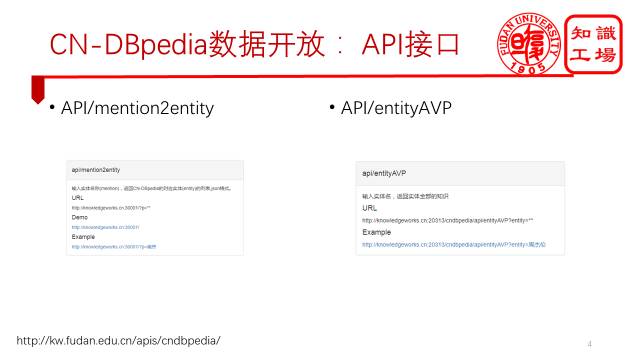 当然,大家如果想要CN-DBpedia最新的数据,也可以通过API接口的形式来访问。目前提供了两个API,一个是mention2entity,实现输入一个字符串,返回CN-Dbpedia中对应的实体名。另一个是entityAVP,实现输入一个实体,返回这个实体的所有知识。