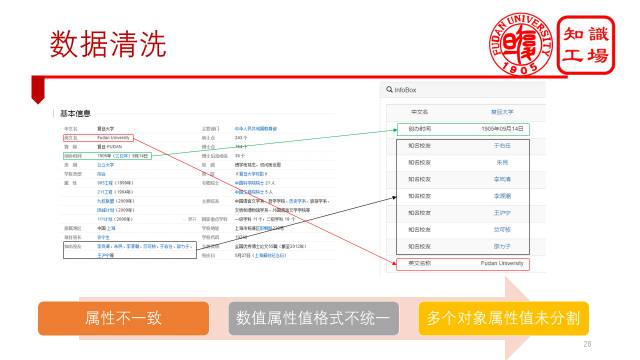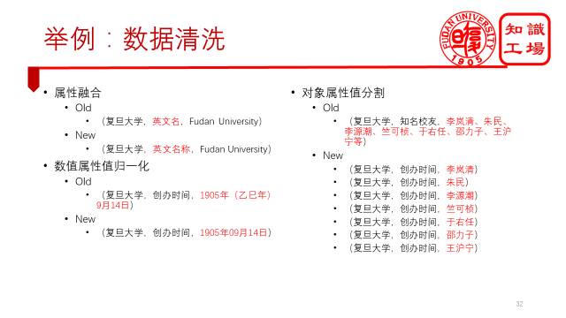 三类数据清洗的例子如图所示。根据属性融合方法,我们将“英文名”改成了“英文名称”。根据数值属性归一化方法,我们将“1905年(乙巳年)9月14日”统一成“1905年09月14日”。根据对象属性值分割方法,我们将复旦大学的知名校友给分割开来。