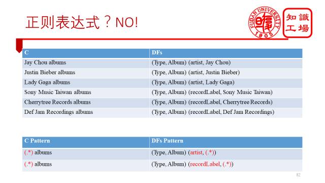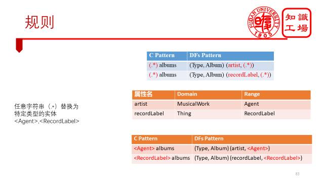 当我们将这个任意字符串(.*)限定为特定类型的实体<Agent>,<RecordLabel>时,我们发现,这样总结出来的规则就能很好的匹配上诉的例子了。具体如何对任意字符串进行限定了,我们可以根据属性的值域range来进行限定。