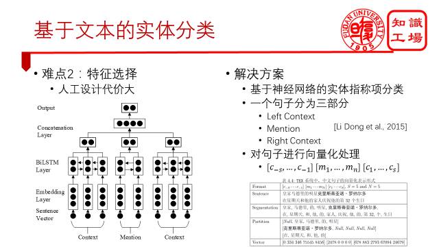 针对这个难点,我们采用了神经网络模型。这里需要注意的是,我们是要对mention进行typing,而不是对句子进行typing,这就需要在神经网络模型里面明确的告知mention在哪里。因此,我们将句子拆分为了三部分,mention部分,和它的左右context部分,这三部分都是固定长度的,缺了就补0,多了就删掉。最后,将这三个模型分别通过lstm来抽取特征再合并起来。