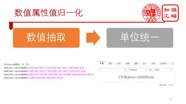 之所以要对数值属性归一化,是因为数值属性的属性值往往是由数字+ 单位构成。所以可以分为数值抽取和单位统一两个步骤,比如通过正则表达式抽取出年、月、日等数值信息,通过转化公式来统一单位。