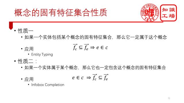 2、如果一个实体属于某个概念,那么它也一定包含这个概念的固有特征集合。这个性质可以用来帮助我们做infobox completion.