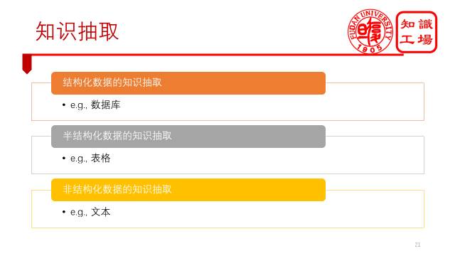 知识抽取大致能分为三类,一类是结构化数据知识抽取,比如说从数据库里面抽取知识。另一类是半结构化知识数据抽取,比如说从表格里面抽取知识。第三类是非结构化知识数据抽取,比如说从文本里面抽取知识。