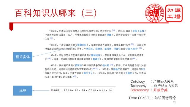 还有就是相关实体关系, 如下图中蓝色字体部分,代表着一个与当前实体有联系的其他实体。另外就是标签了。根据“知识图谱导论”课程上说的,知识体系分为三类。第一类是ontology,不同层节点之间是严格的IsA关系,可以适用于知识的推理。第二类是Taxonomy,上下位节点之间是非严格的IsA关系,可以表示概念的二义性。第三类是Folksonomy,能够涵盖更多的概念,但难以进行标签管理。